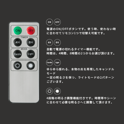 サイズ:L/約径7.5×高さ14.8cm、M/約径7.5×高さ12.4cm、S/約径7.5×高さ9.8cm 製品重量:L/約290g、M/245g、S/205g 材質:キャンドル/蝋、LED発光部・電池ケース・リモコン/プラスチック 使用電池:キャンドル本体/単4電池×2本、リモコン/ボタン電池×1(CR2025) 連続点灯時間:約100時間※使用環境や電池の性能によって変化します。